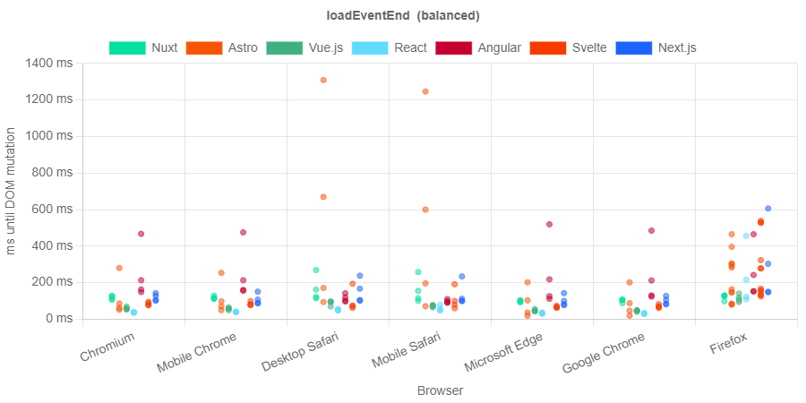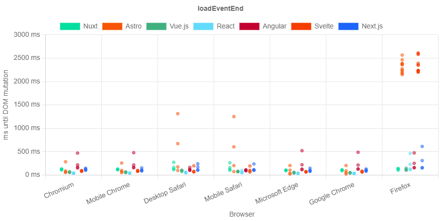 Angeglichenen Werte - einziger Unterscheid: Firefox - Rest: - schlecht: - Angular - Chromium, Mobile Chrome, Microsoft Edge, Google Chrome - Astro - Desktop Safari, Mobile Safari