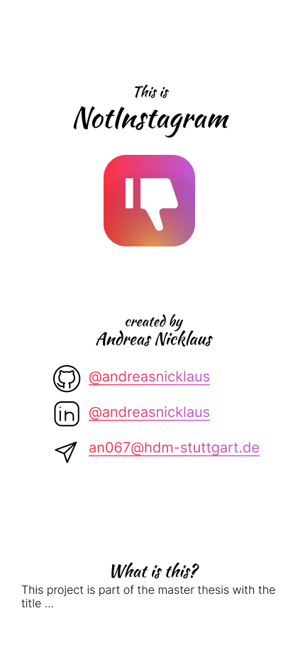 Im Instagram-Klon kann der Anwender Eindrücke und Gedanken in Bildform teilen und an den visuellen Eindrücken seiner Bekannten teilhaben. Nebst der Feed-Funktion wie sie vom Original bekannt sind, können in Profilansichten persönliche Informationen geteilt werden.