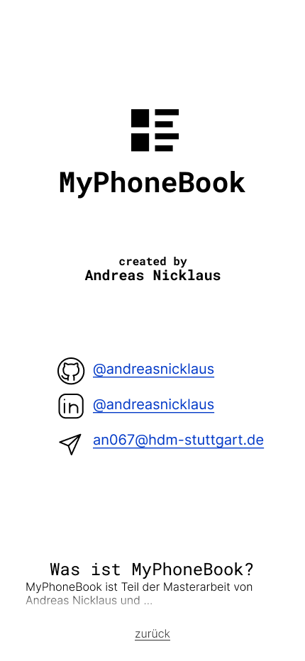 Mit der Kontaktlisten-App soll der Anwender seine Kontakte speichern und verwalten können. Dazu soll es dem Anwender möglich sein, alle Kontaktdaten wie beispielsweise Telefonnummern, E-Mail-Adressen, Heimatadressen etc. zu speichern und mit Labels zu versehen.