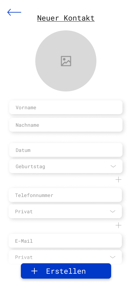 - “Neuer Kontakt”-Seite: Ausfüllformular zum Neuanlegen/Bearbeiten eines Kontakts