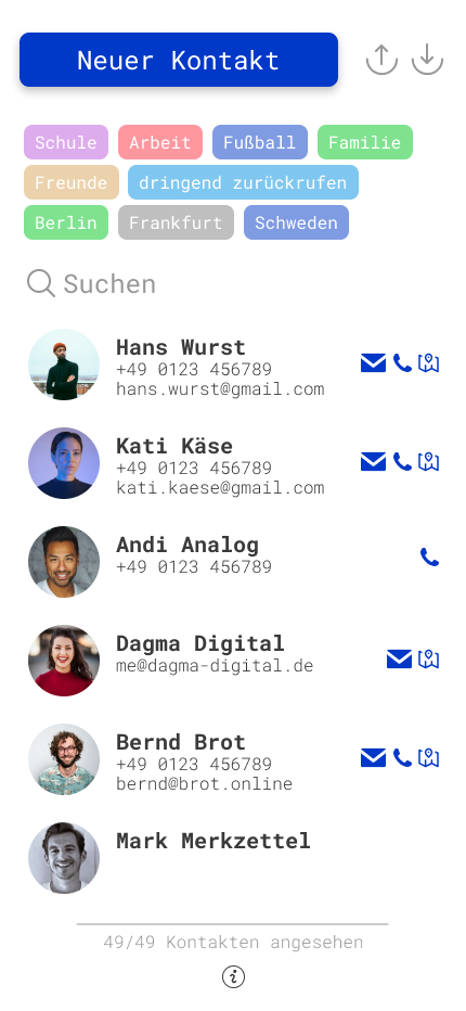 - Telefonbuch-Seite: Menü, “Neuer Kontakt”-Button, Kontaktliste und Filter- und Sortierungsmenü